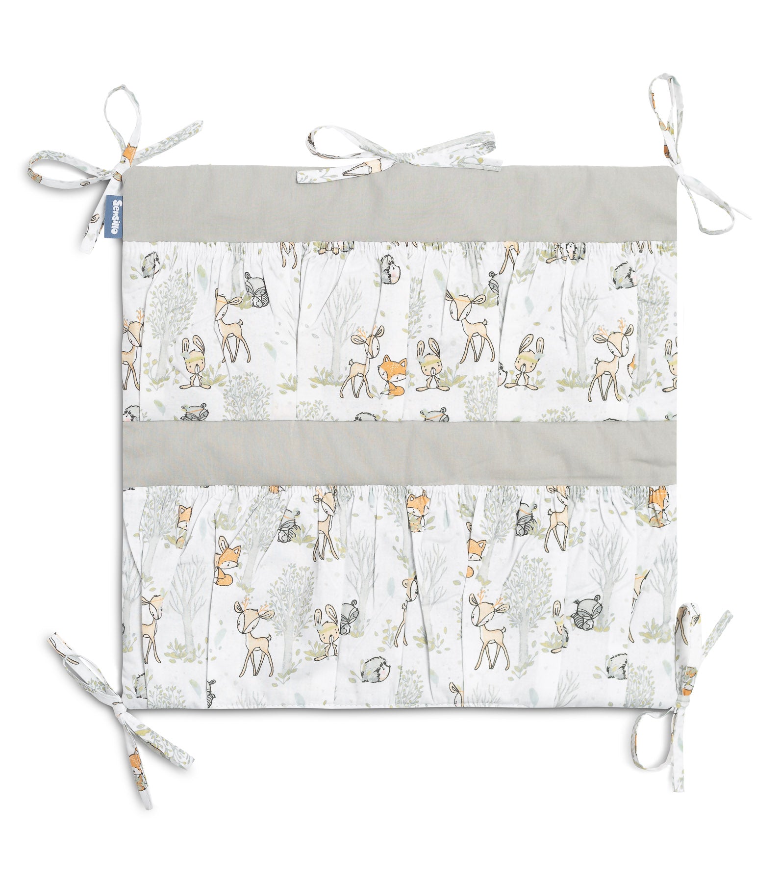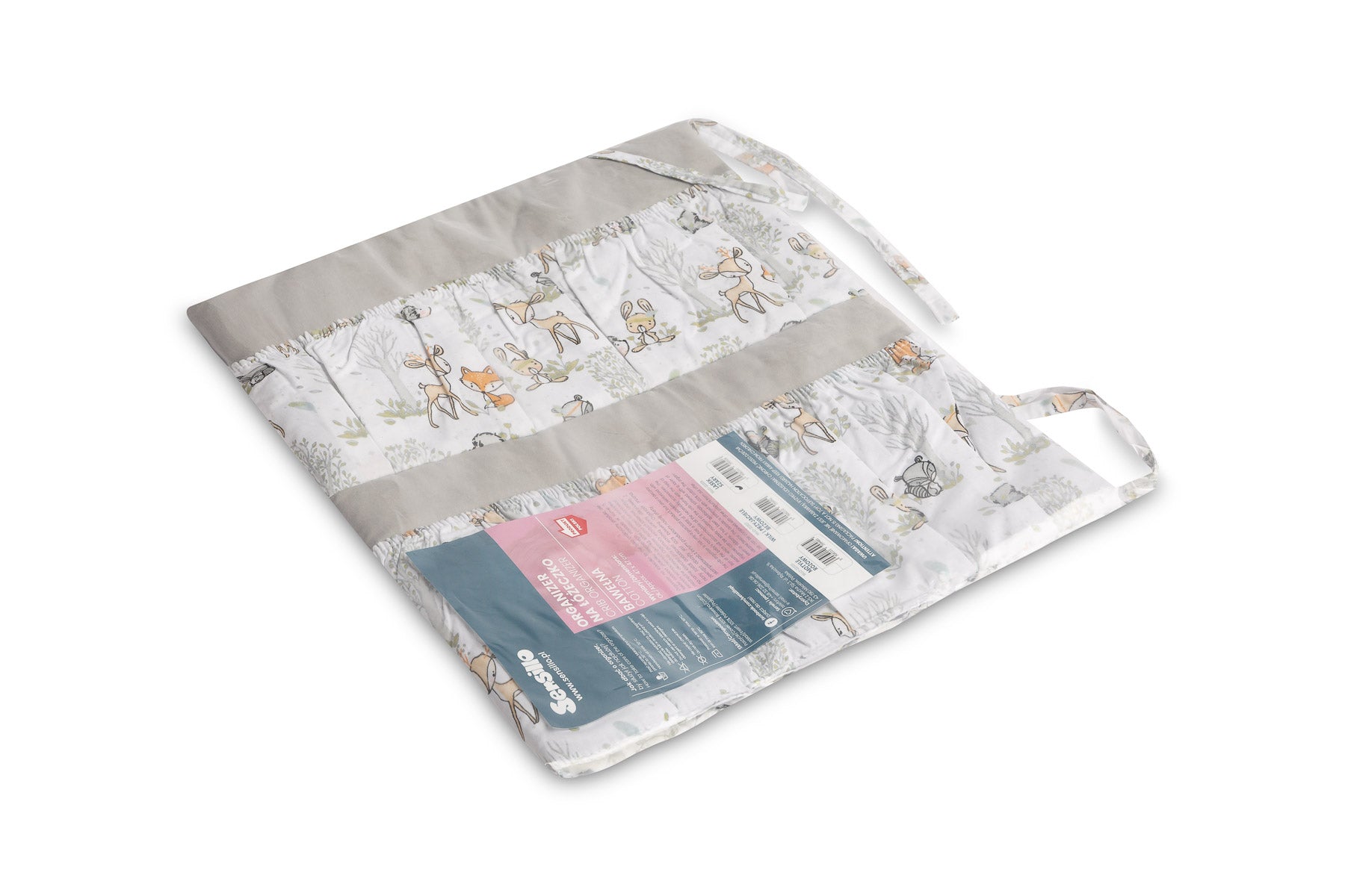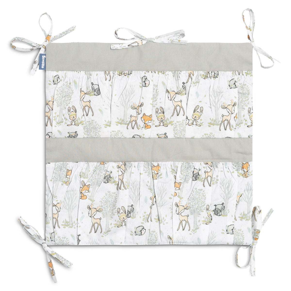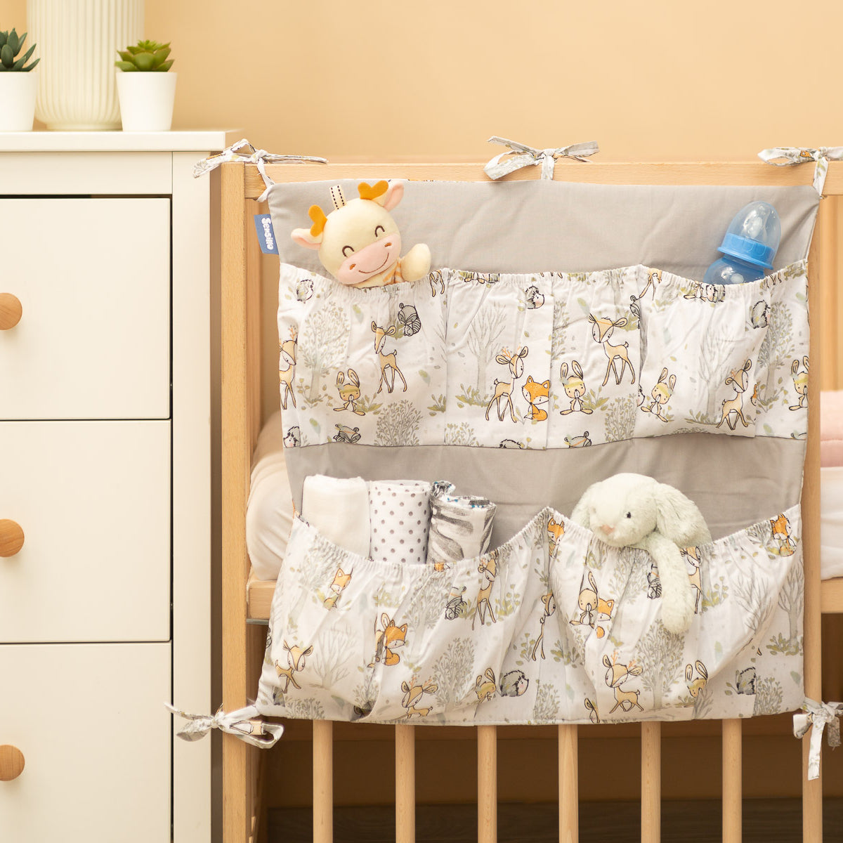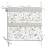 De organizer voor het ledikant is niet alleen een praktisch product, maar ook een decoratie voor de babykamer. Hij heeft in totaal 5 vakken, versterkt met elastiek, die alle benodigde accessoires kunnen bevatten. De organizer kan eenvoudig aan het bedframe worden bevestigd met behulp van ingenaaide banden. Daarnaast is hij versterkt met een laag siliconenvlies. De buitenkant is afgezet met 100% katoen. De organizer kan gecombineerd worden met andere producten uit ons assortiment.