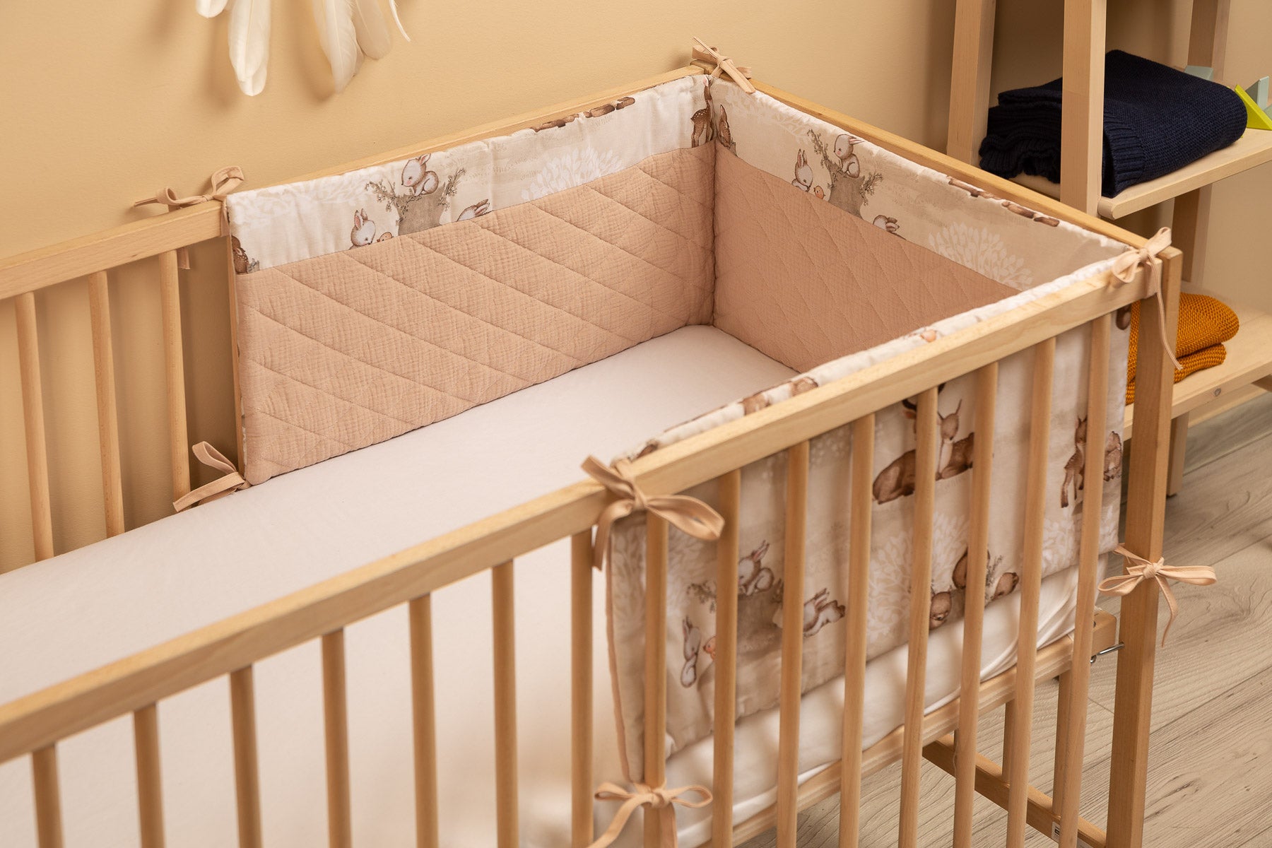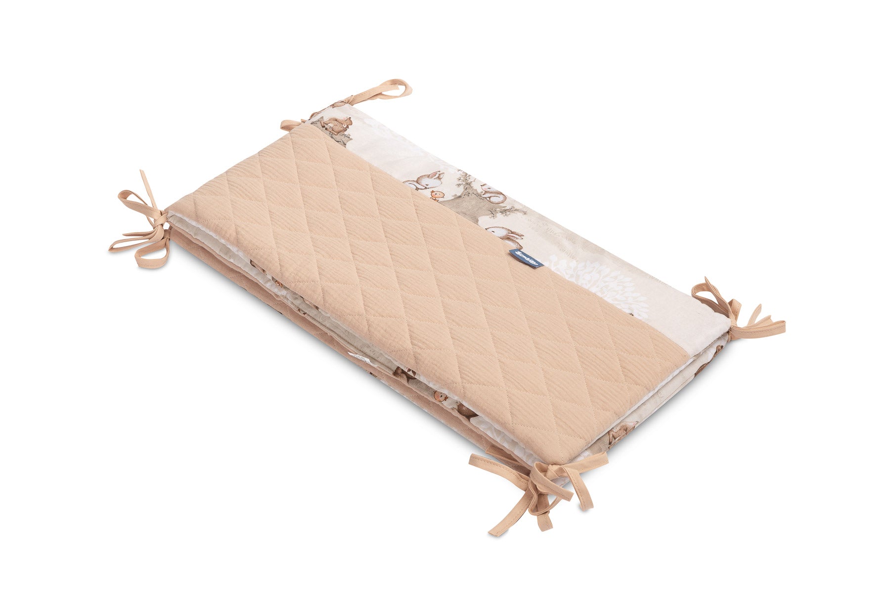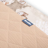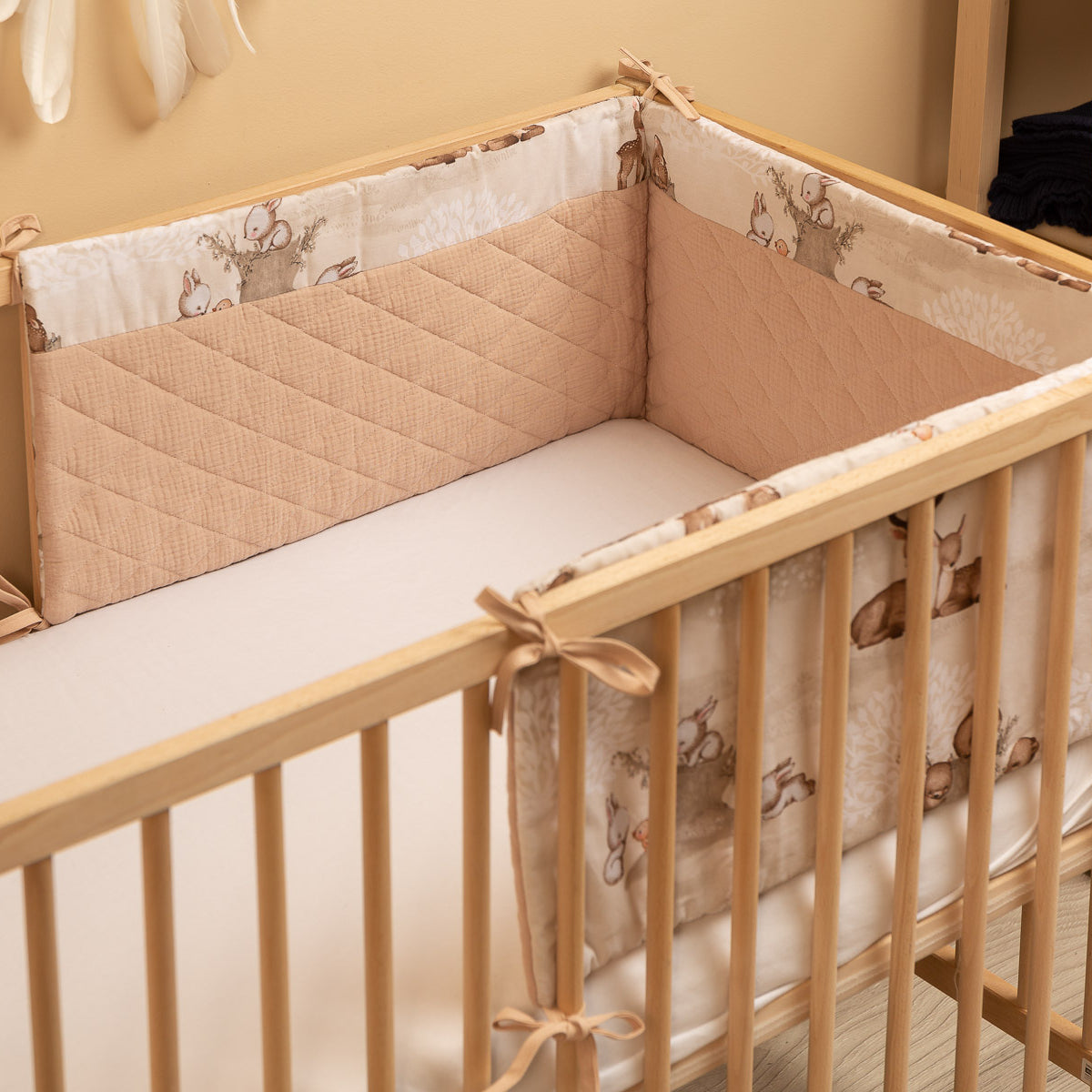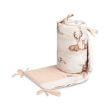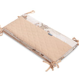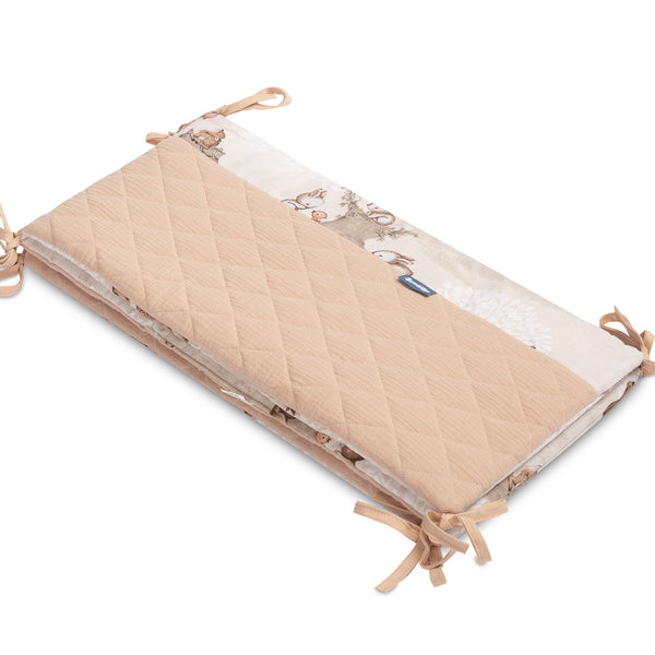 De beschermrand voor het ledikantje past op elk standaard kinderbedje. De rand is gemaakt van zacht bedrukt katoen en aangenaam aanvoelende mousseline. De polyester vulling zal de baby beschermen tegen verwondingen tijdens het bewegen in het bedje. De rand blijft op zijn plaats dankzij de linten waarmee hij aan de spijlen van het bedje wordt bevestigd. Hij is bedoeld voor een bedje met afmetingen van 120x60 cm. De rand zal een uitstekende aanvulling zijn op de babyuitrusting.
