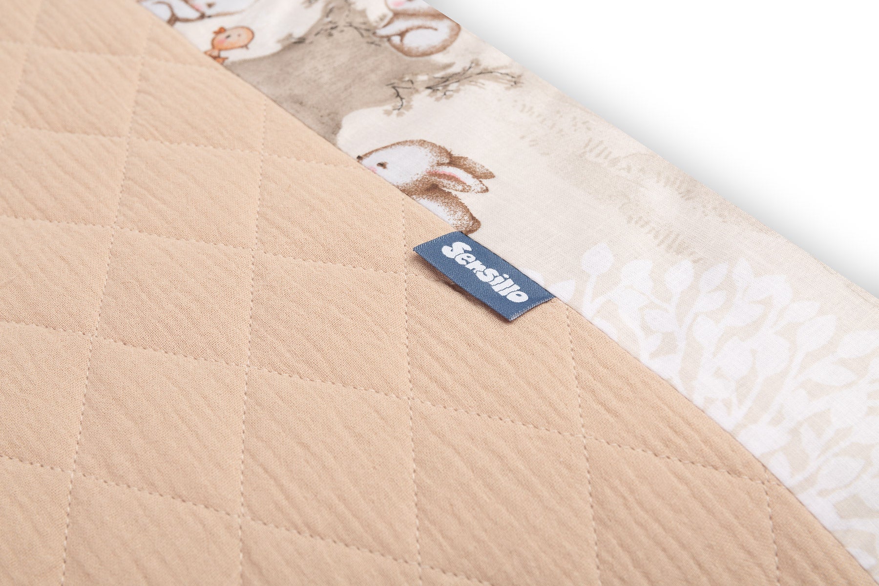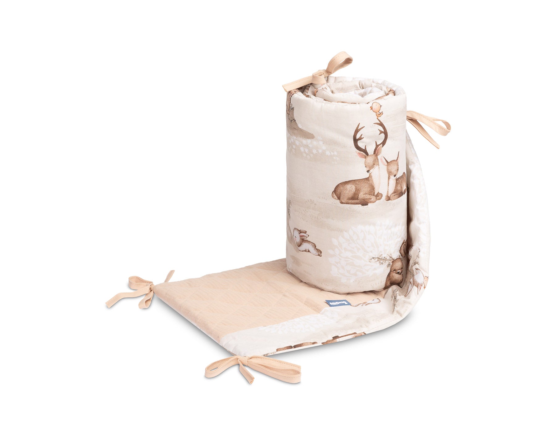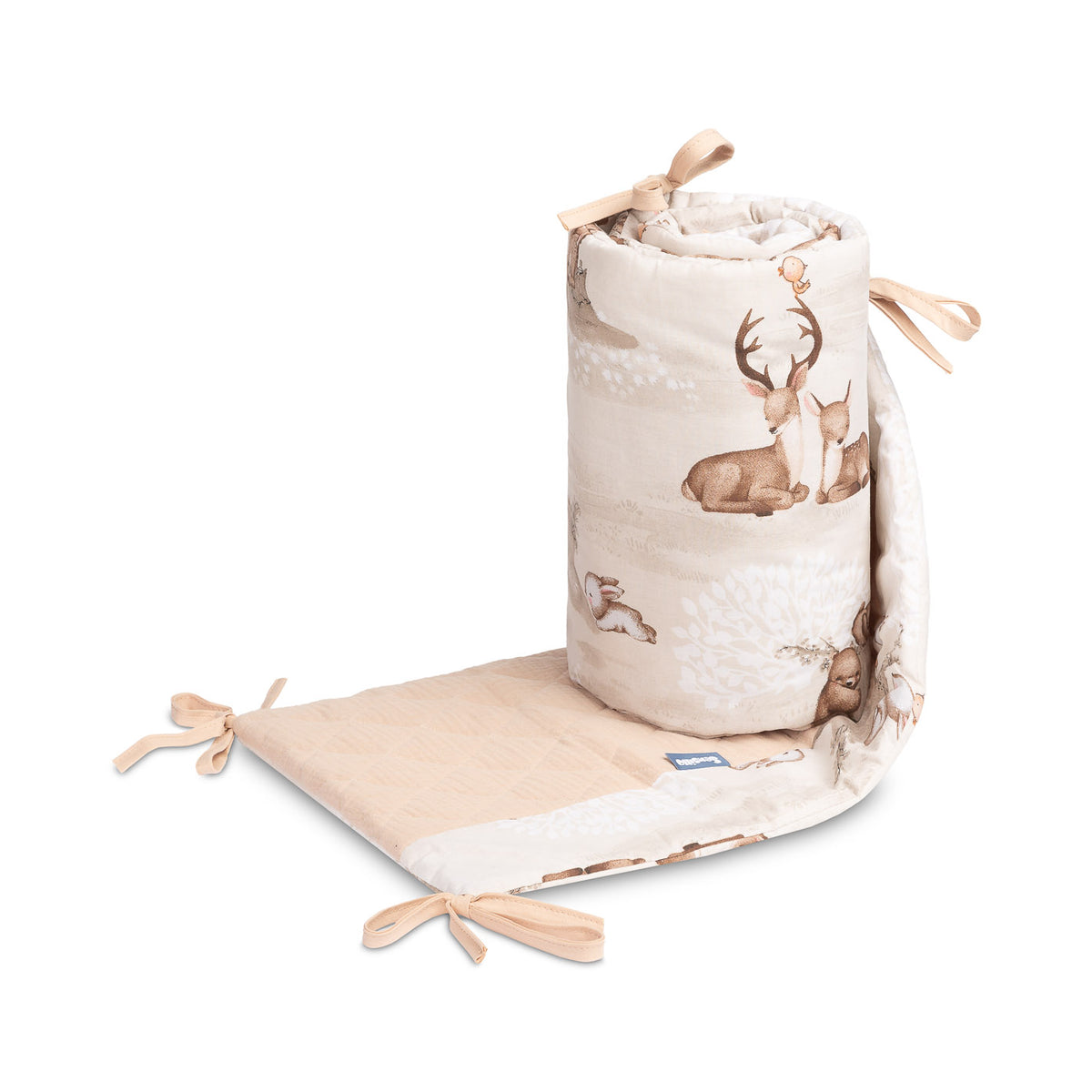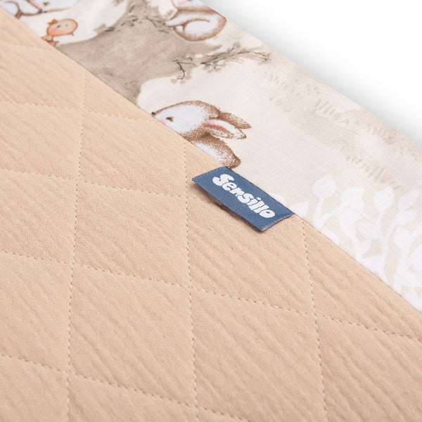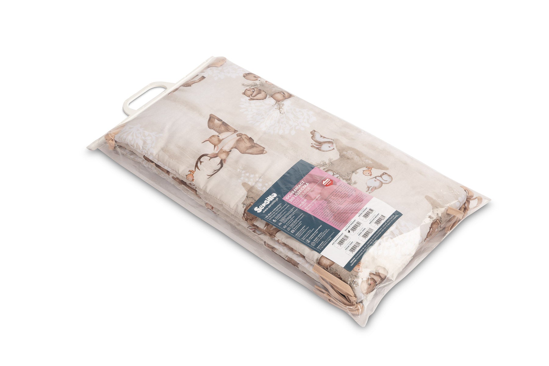 De beschermrand voor het ledikantje past op elk standaard kinderbedje. De rand is gemaakt van zacht bedrukt katoen en aangenaam aanvoelende mousseline. De polyester vulling zal de baby beschermen tegen verwondingen tijdens het bewegen in het bedje. De rand blijft op zijn plaats dankzij de linten waarmee hij aan de spijlen van het bedje wordt bevestigd. Hij is bedoeld voor een bedje met afmetingen van 120x60 cm. De rand zal een uitstekende aanvulling zijn op de babyuitrusting.